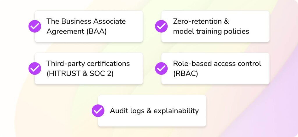 Before looking at specific tools, healthcare buyers must understand how to evaluate them. Your organization acts as the “Covered Entity,” and you are responsible for vetting your “Business Associates” (vendors). Use these five pillars to judge any AI tool.