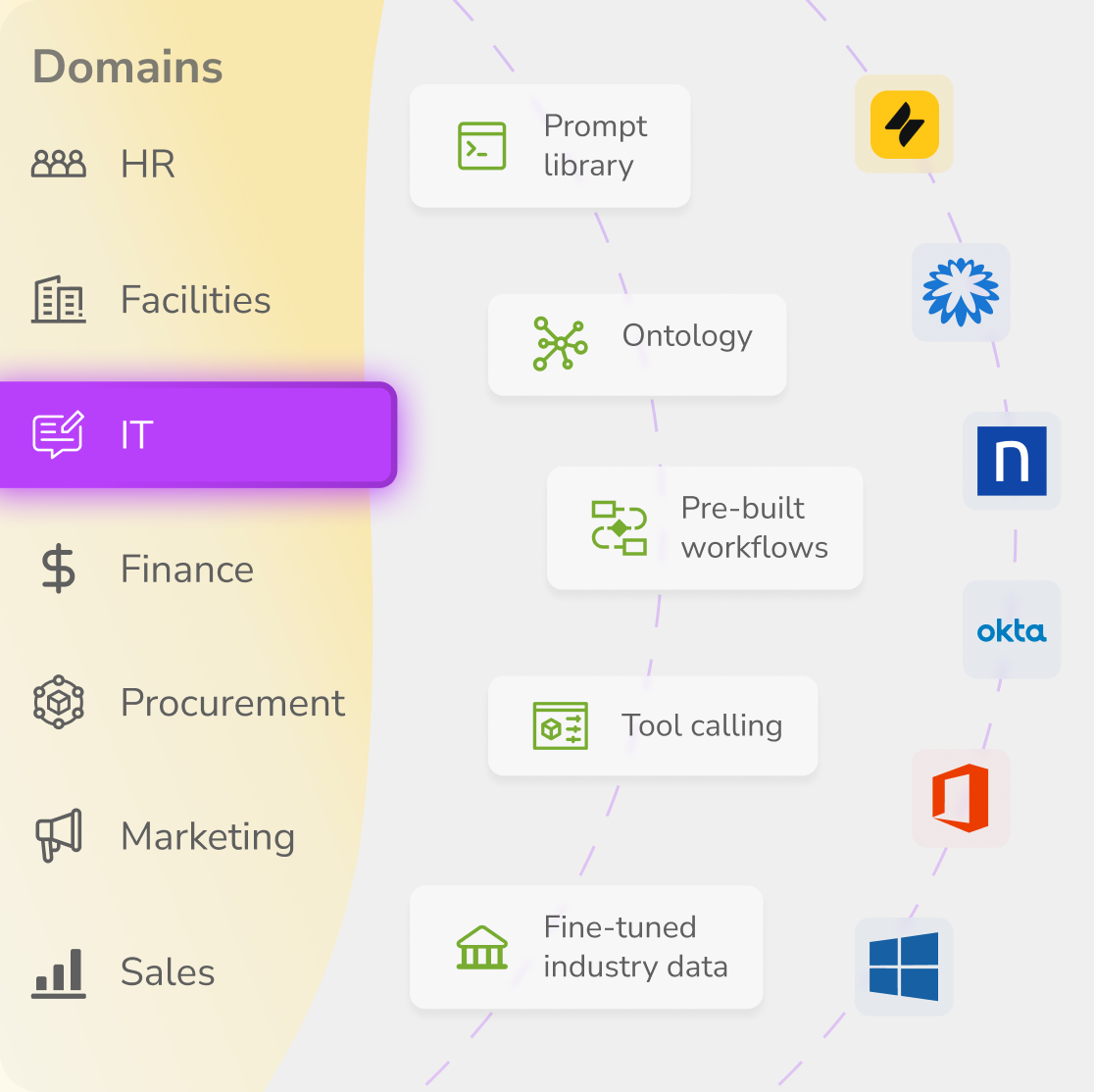 Select and deploy from a collection of purpose-built AI agents across domains like IT, HR, Finance, and more.