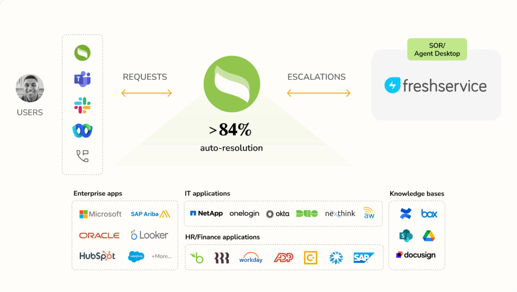 Aisera’s AI Agent platform integrates with Freshservice, enabling a system of AI agents that reason, plan, and orchestrate to take autonomous actions across IT, HR, and more to scale support, boost productivity and auto-resolution, and deliver immediate ROI.