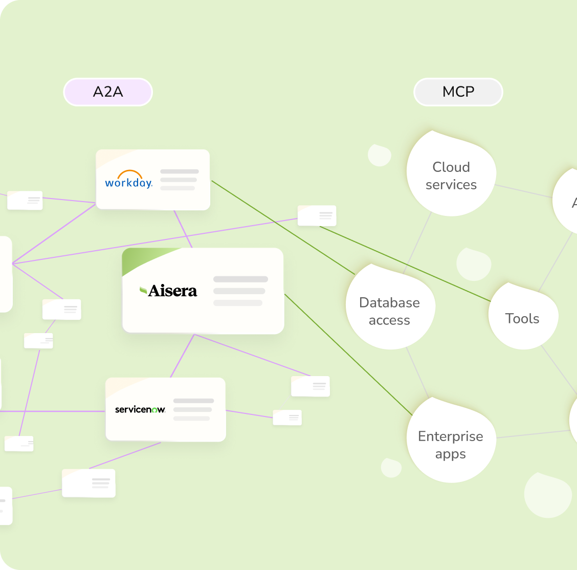 Connect any agent (native or third-party), app, channel, or system of record to future-proof integration and scale with native support for A2A, MCP, and AGNTCY.