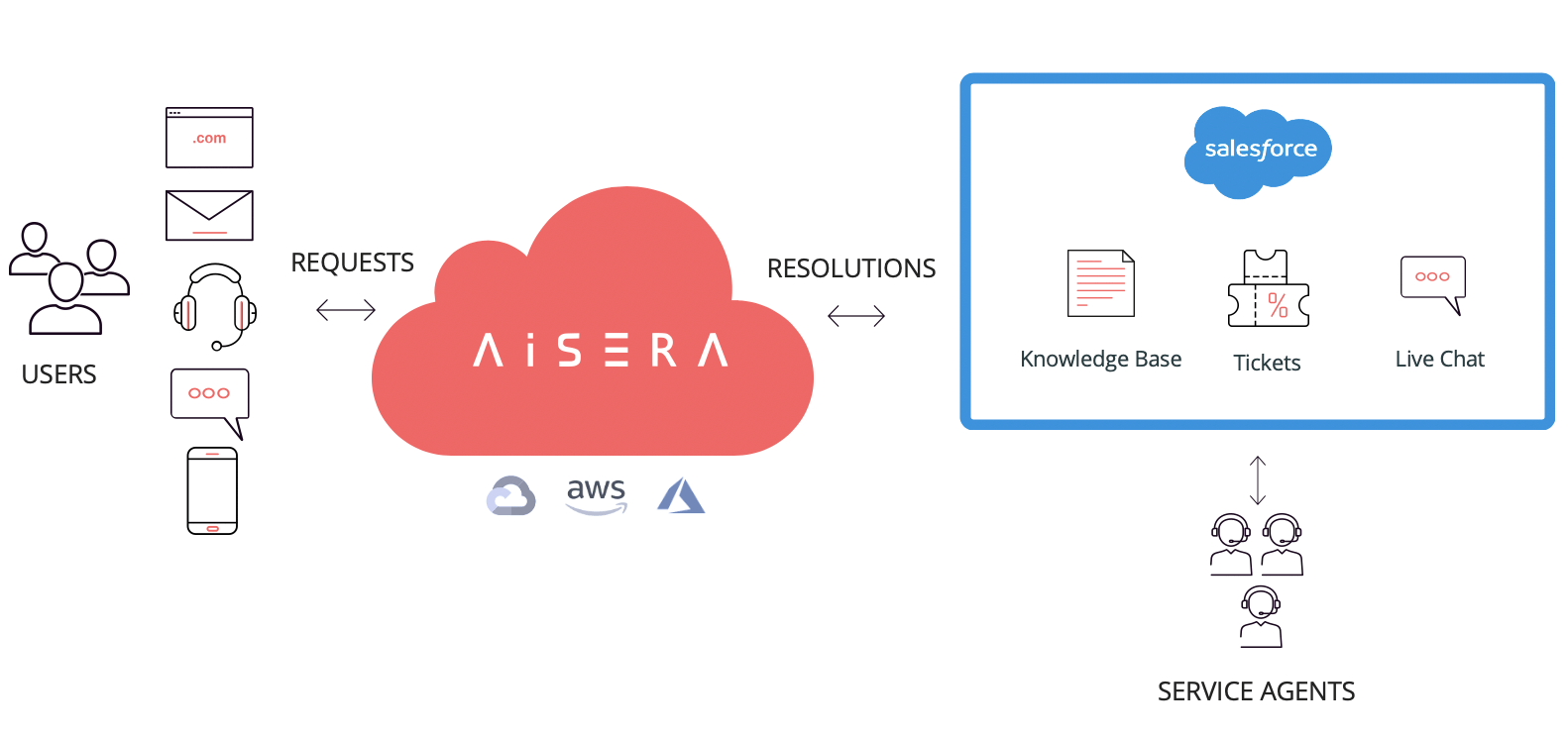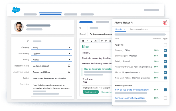 Aisera leverages Knowledge Base, cases, and live chat on Salesforce to auto-resolve incoming support requests and auto-classify cases with intelligent automation, supporting service agents and creating exceptional self-service resolutions for customers.