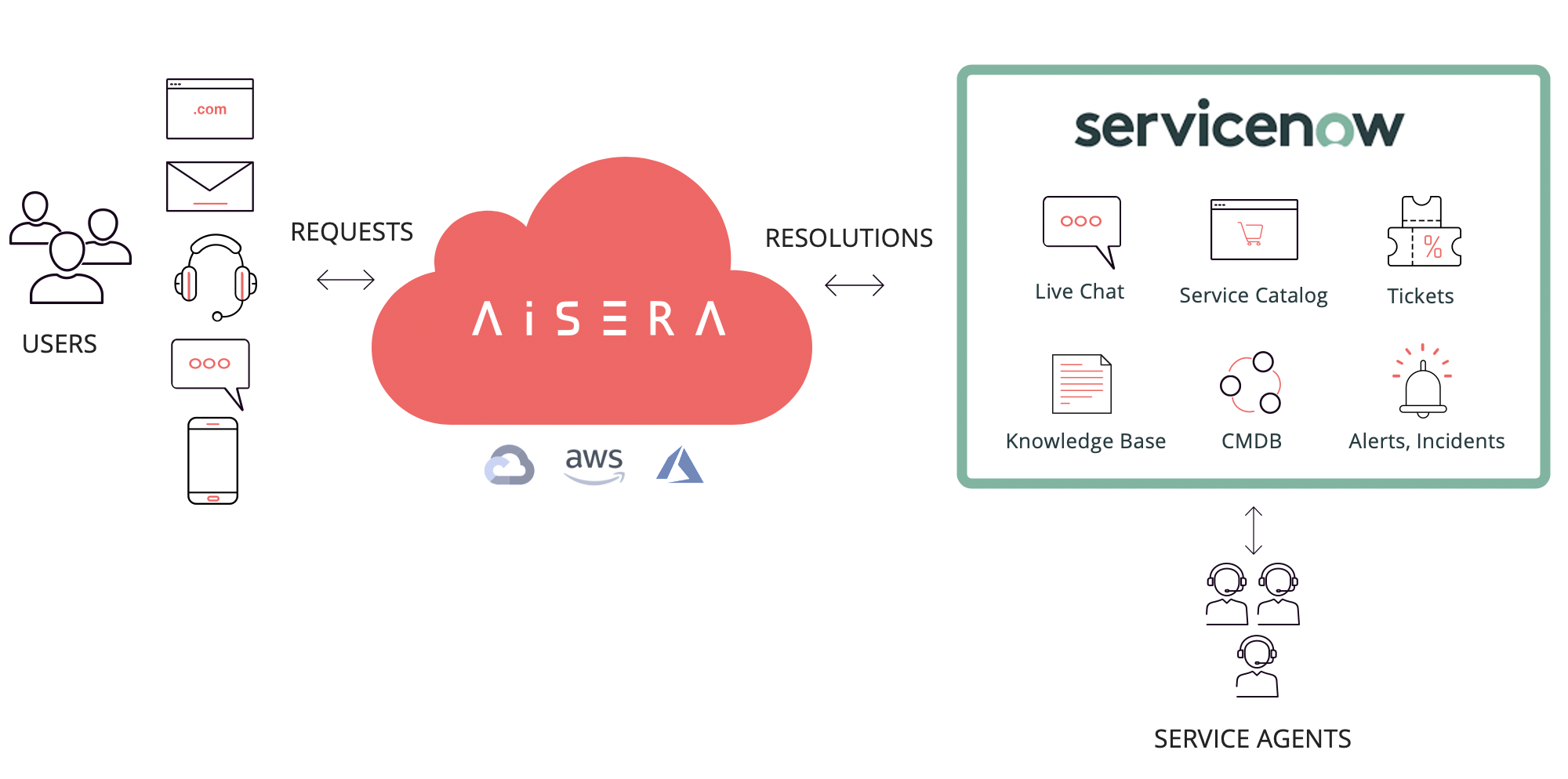 Aisera leverages knowledge base, tickets, live chat, service catalog, CMDB, alerts, and incidents on ServiceNow to auto-resolve incoming support requests from users and auto-classify cases with intelligent automation, supporting service agents and creating exceptional self-service resolutions for customers.