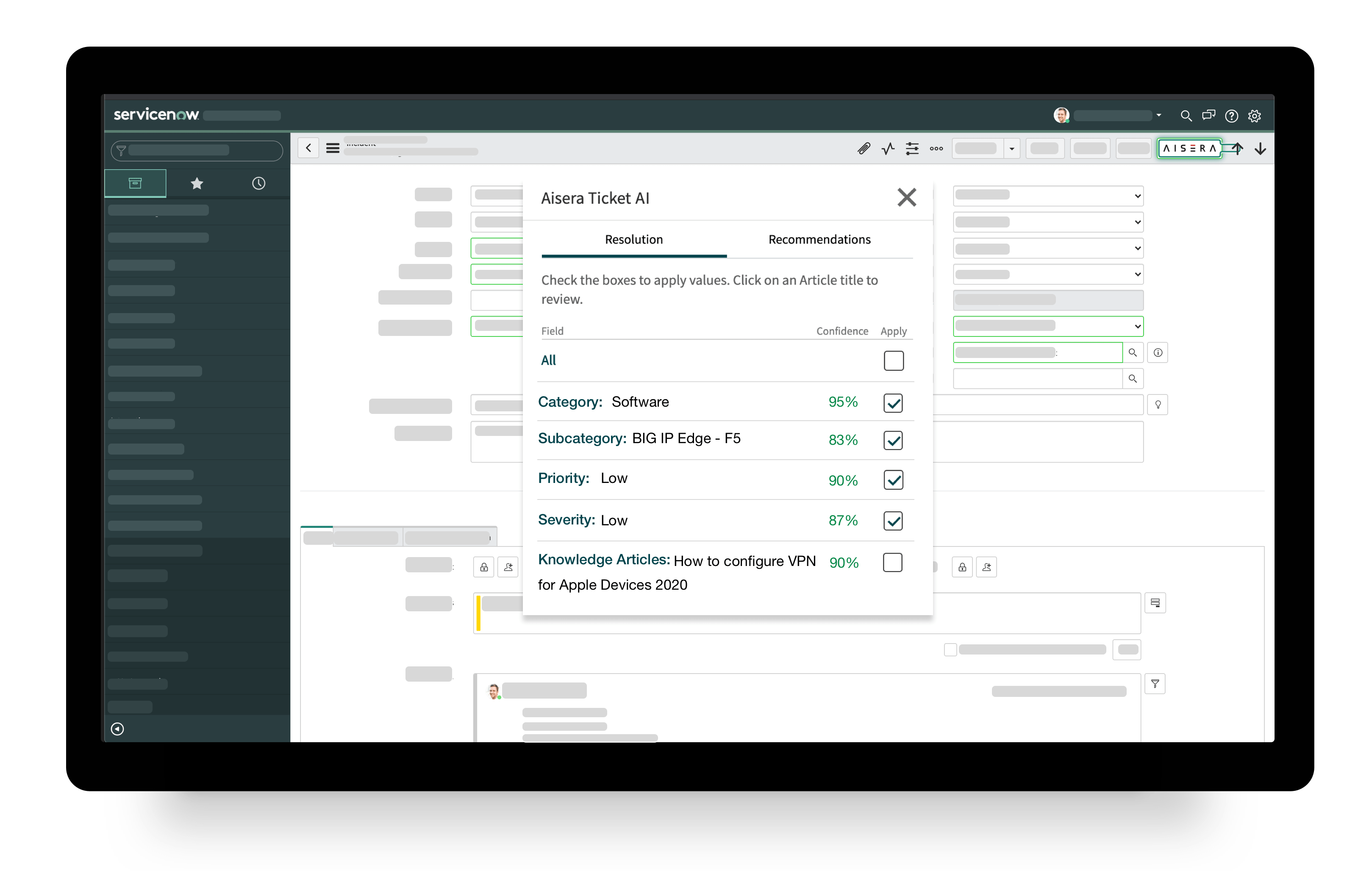 Aisera’s AI Copilot solution brings true automation and employee satisfaction to work environments with ServiceNow ITSM chatbot integration. By providing Conversational AI, RPA, and Ticket AI, Aisera’s solution drives workplace productivity with robust self-service resolutions. Aisera’s Ticket AI autonomously classifies, routes, and resolves tickets to improve employee experience and drastically reduce agent workload. Aisera also natively integrates incidents, requests, changes, service catalogs, knowledge base, service portal, alerts, and CMDB to deliver value on Day One.