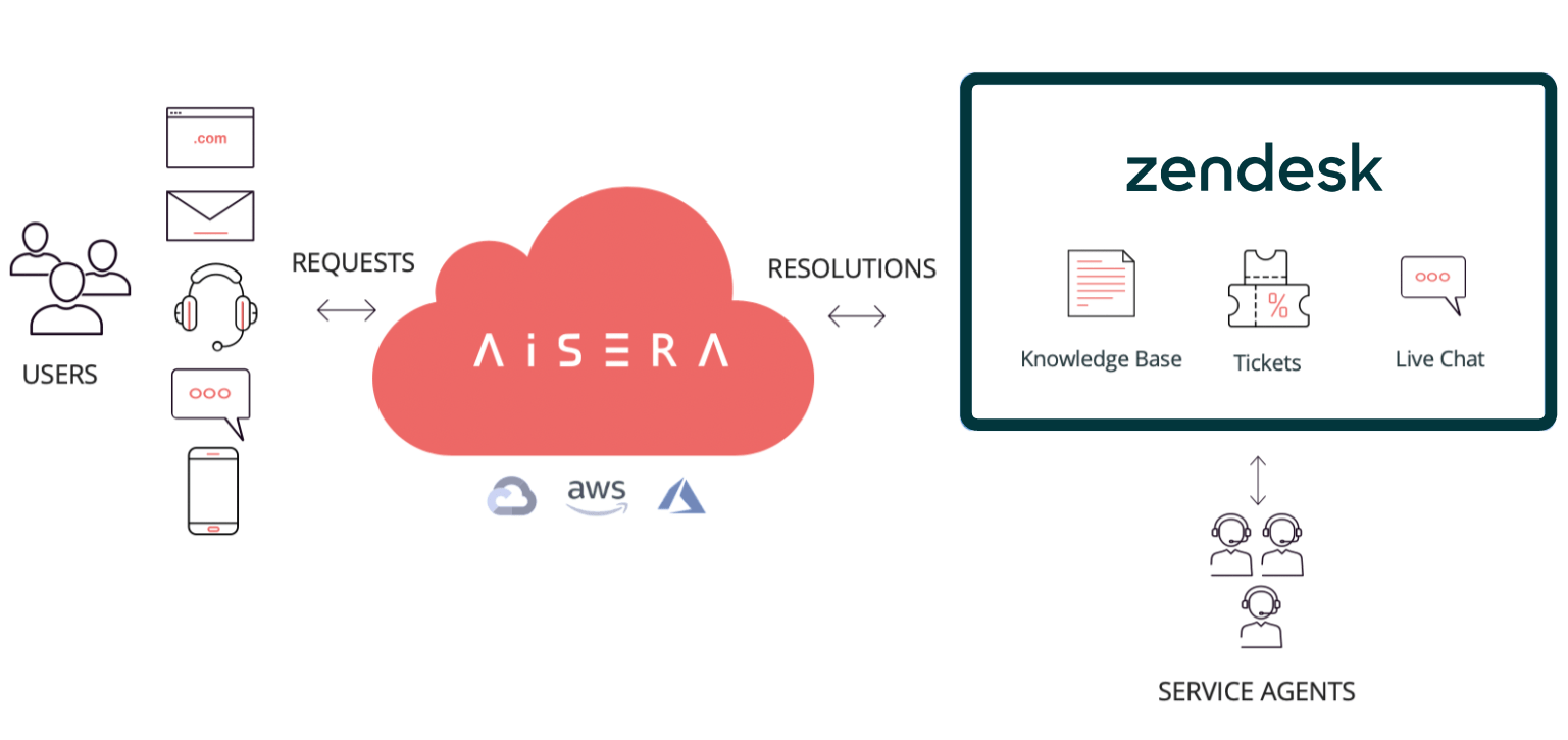 Aisera leverages Knowledge Base, cases, and live chat on Zendesk to auto-resolve incoming support requests and auto-classify cases with intelligent automation, supporting service agents and creating exceptional self-service resolutions for customers.