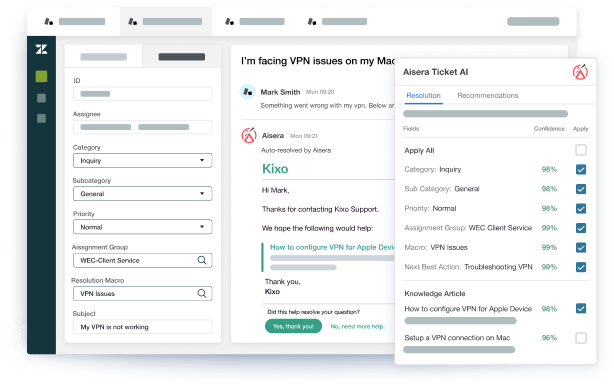 Use Aisera’s Ticket AI seamlessly integrated with Zendesk to empower users with self-service resolutions and automatic classification, routing, custom case attributing, and applying macros as well as Agent-Assist capabilities.