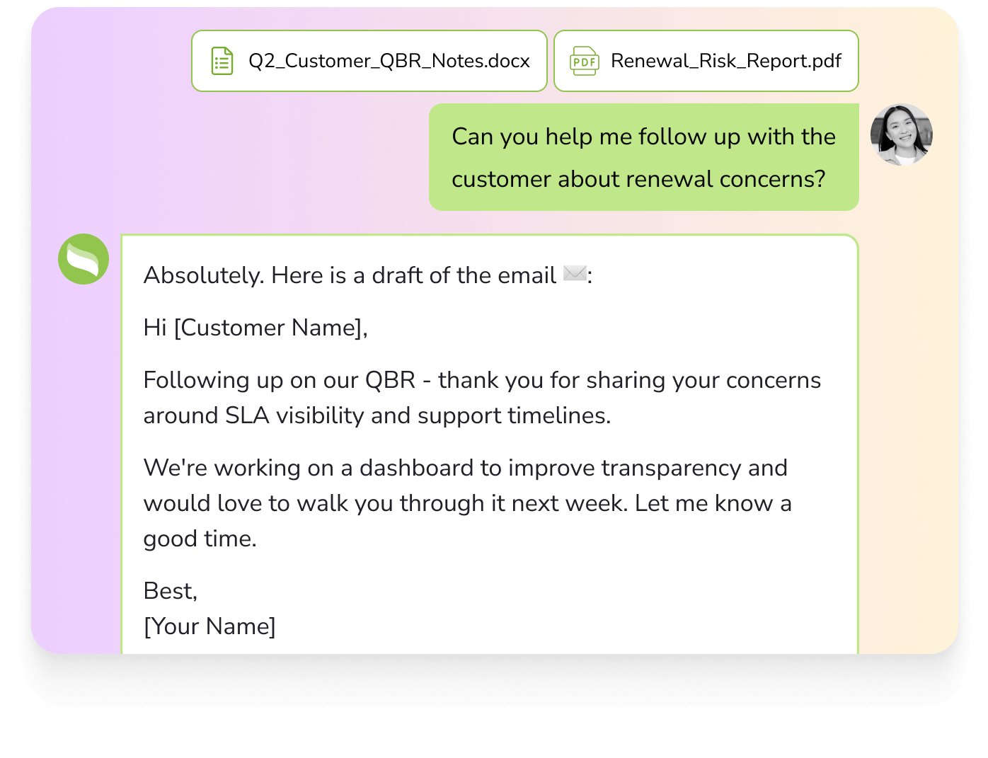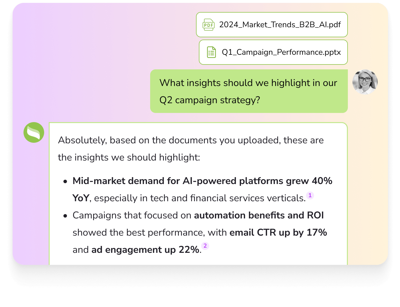 AI-driven document summarization and insight-extraction feature that allows enterprises to upload documents (contracts, reports, policies etc.), ask questions about them, and get actionable summaries and insights quickly.