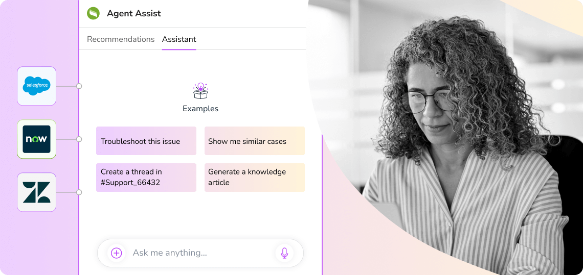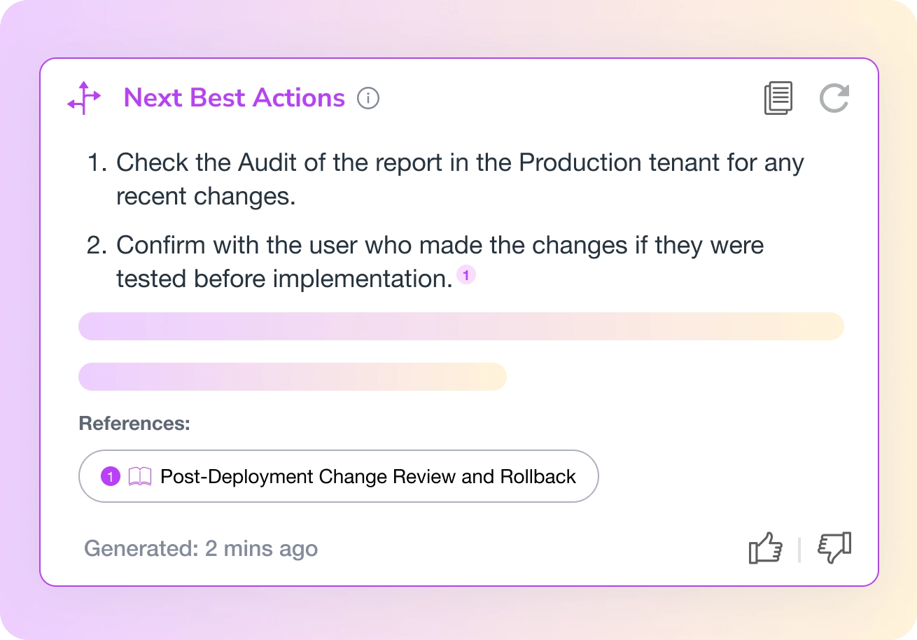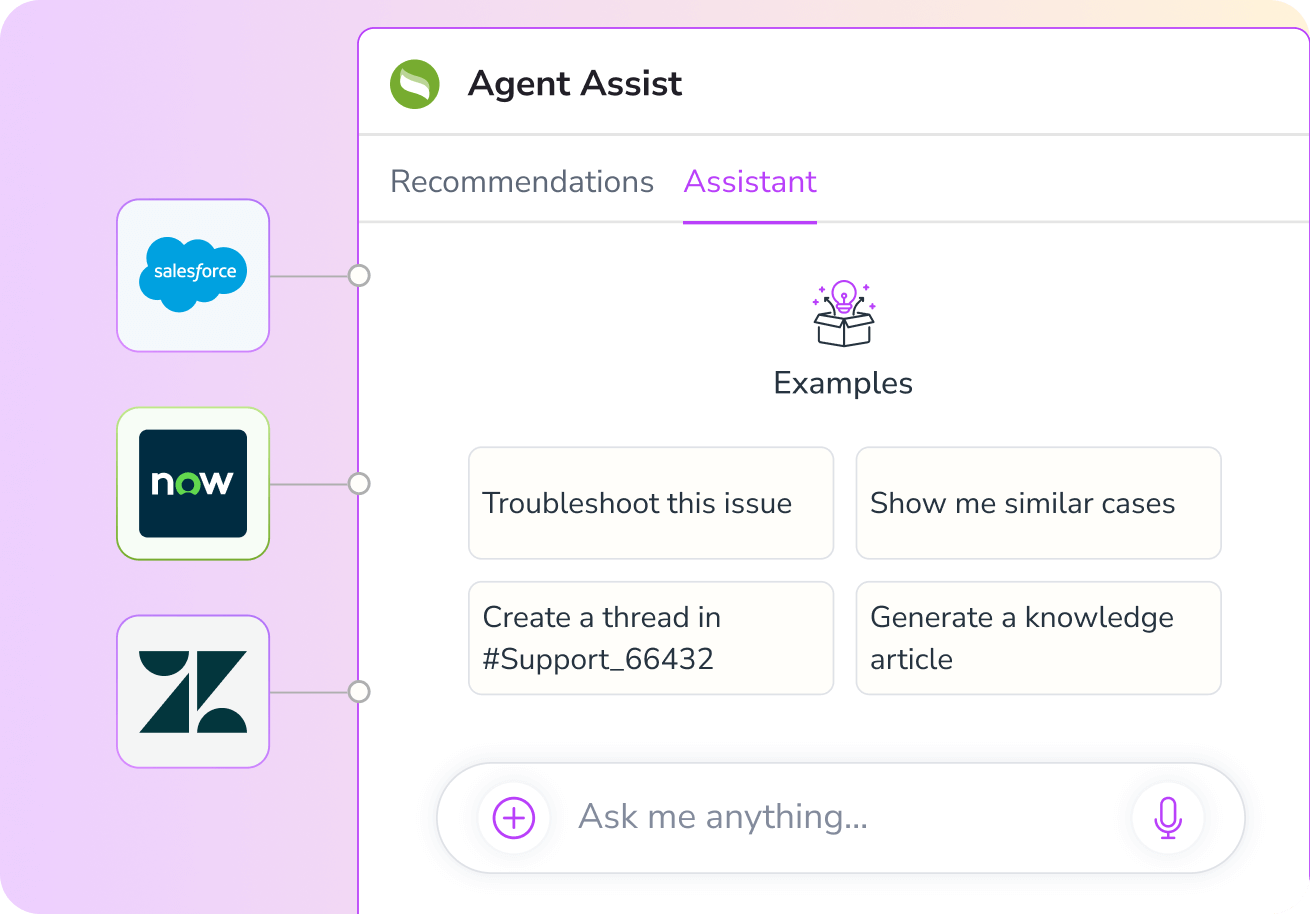 A common example is when a support agent gets a real-time suggestion fixing a SSO sync issue, along with validated troubleshooting steps and a guided workflow to execute the action. Another example is when the system automatically surfaces relevant CRM data, user history, or billing information based on what the customer is asking. These AI recommendations help agents respond confidently and resolve issues more efficiently.