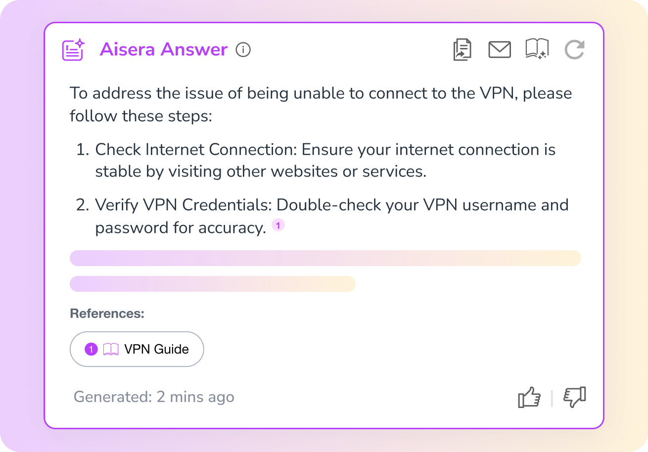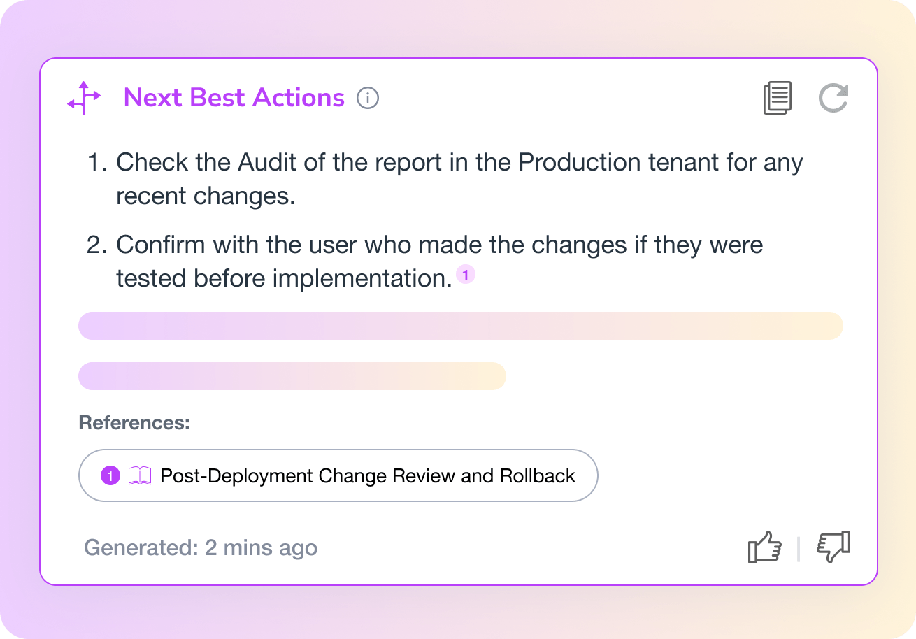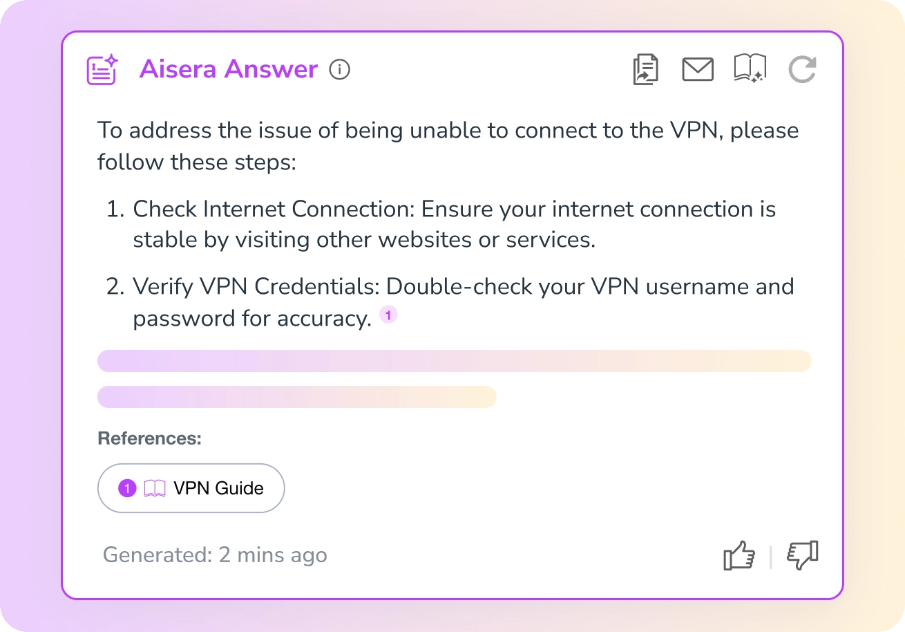 A common example is when a support agent gets a real-time suggestion fixing a SSO sync issue, along with validated troubleshooting steps and a guided workflow to execute the action. Another example is when the system automatically surfaces relevant CRM data, user history, or billing information based on what the customer is asking. These AI recommendations help agents respond confidently and resolve issues more efficiently.