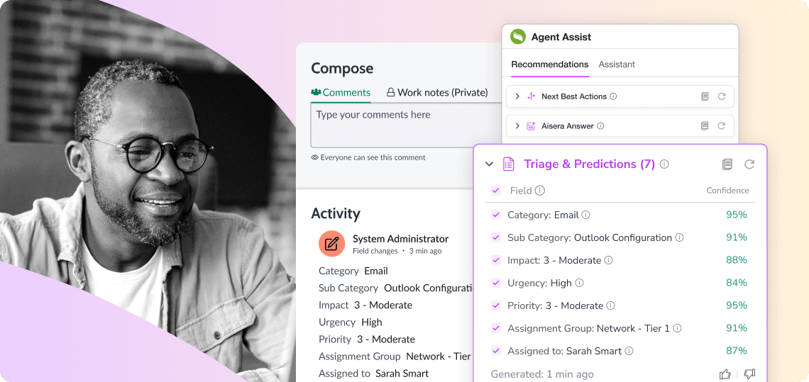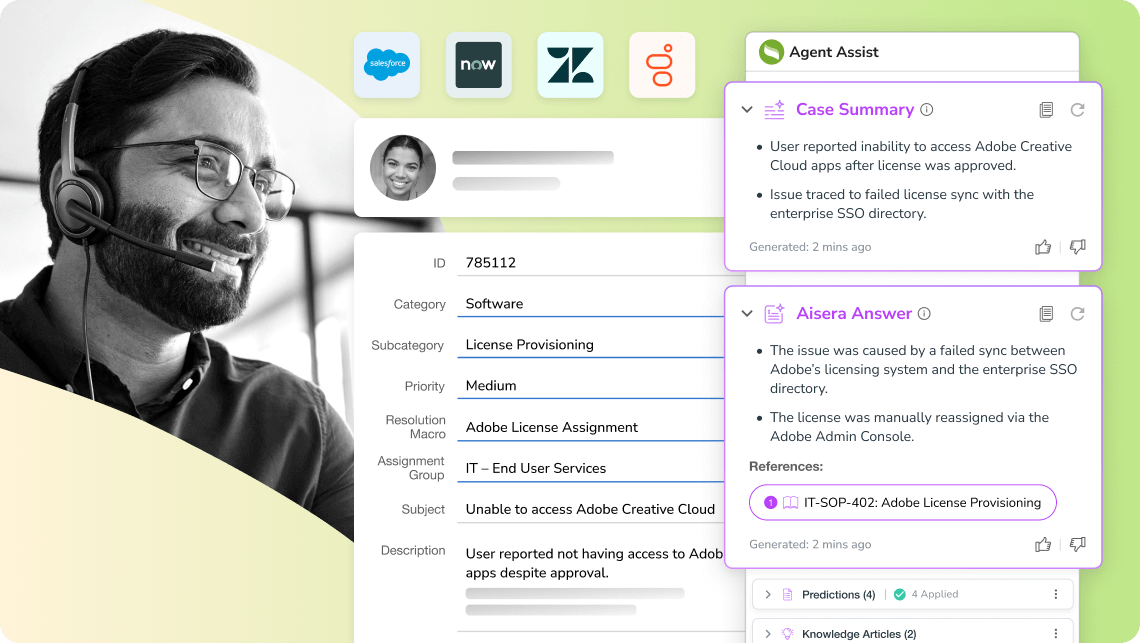 Streamline ticket creation and management with Aisera Agent Assist, using automated workflows for seamless triaging, auto-populated fields, and intelligent routing – all within the embedded agent interface.