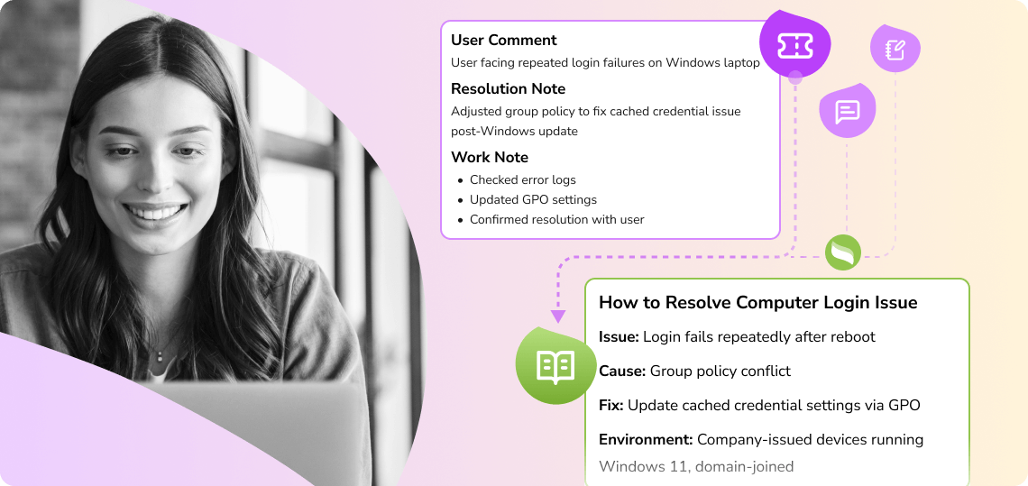 Automatically generate knowledge articles from agent actions with AI agents. When no matching article exists, save new articles to the knowledge base, ensuring faster and more accurate ticket resolution for similar issues in the future.