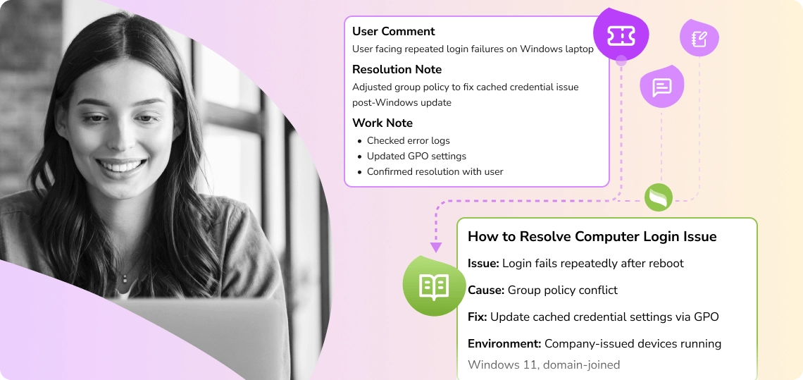 It works by analyzing the conversation as it happens – through voice, chat, or ticket context – and then using AI models to determine the intent behind the request. Based on this understanding, it surfaces knowledge articles, recommended actions, and automated workflows to resolve the issue faster. It continuously learns from historical conversations to improve recommendations and become more context-aware over time.