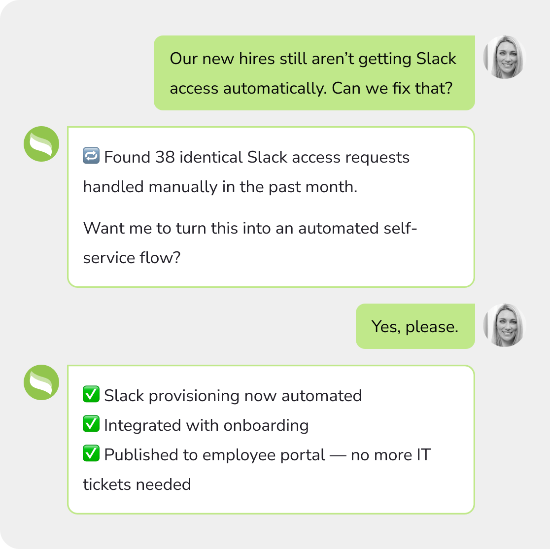 Go beyond answering questions to automating actions that auto-resolve requests, transforming self-service into fully autonomous experiences that get work done.