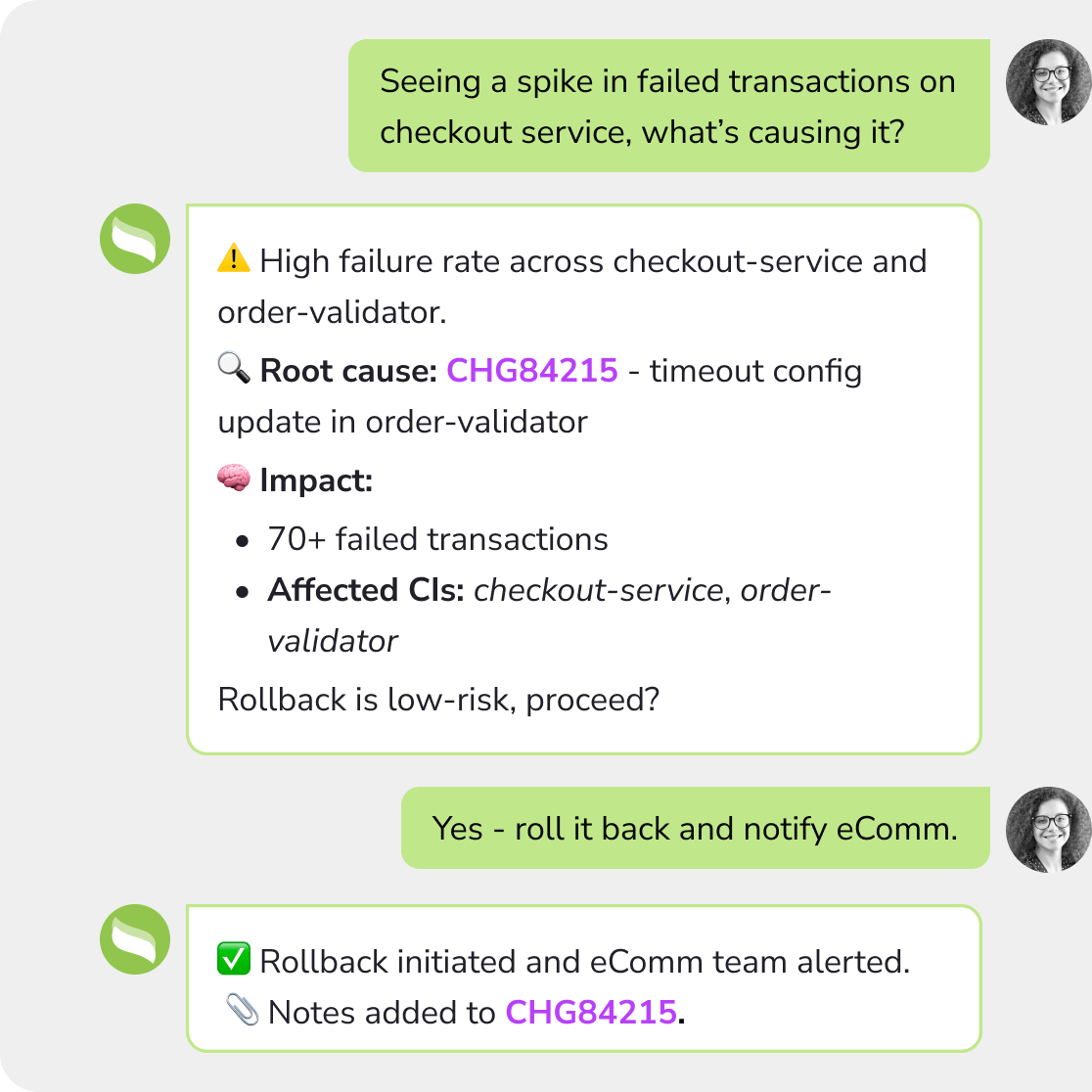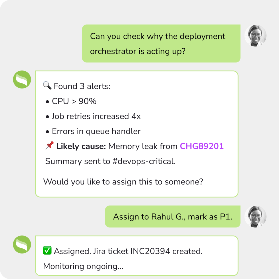 Offer real-time support with Aisera Assistant by converting technical alerts into human-readable notifications. Using natural language, IT agents can inquire about the health status, issues, and root causes of infrastructure and applications, enhancing their ability to manage IT operations efficiently.