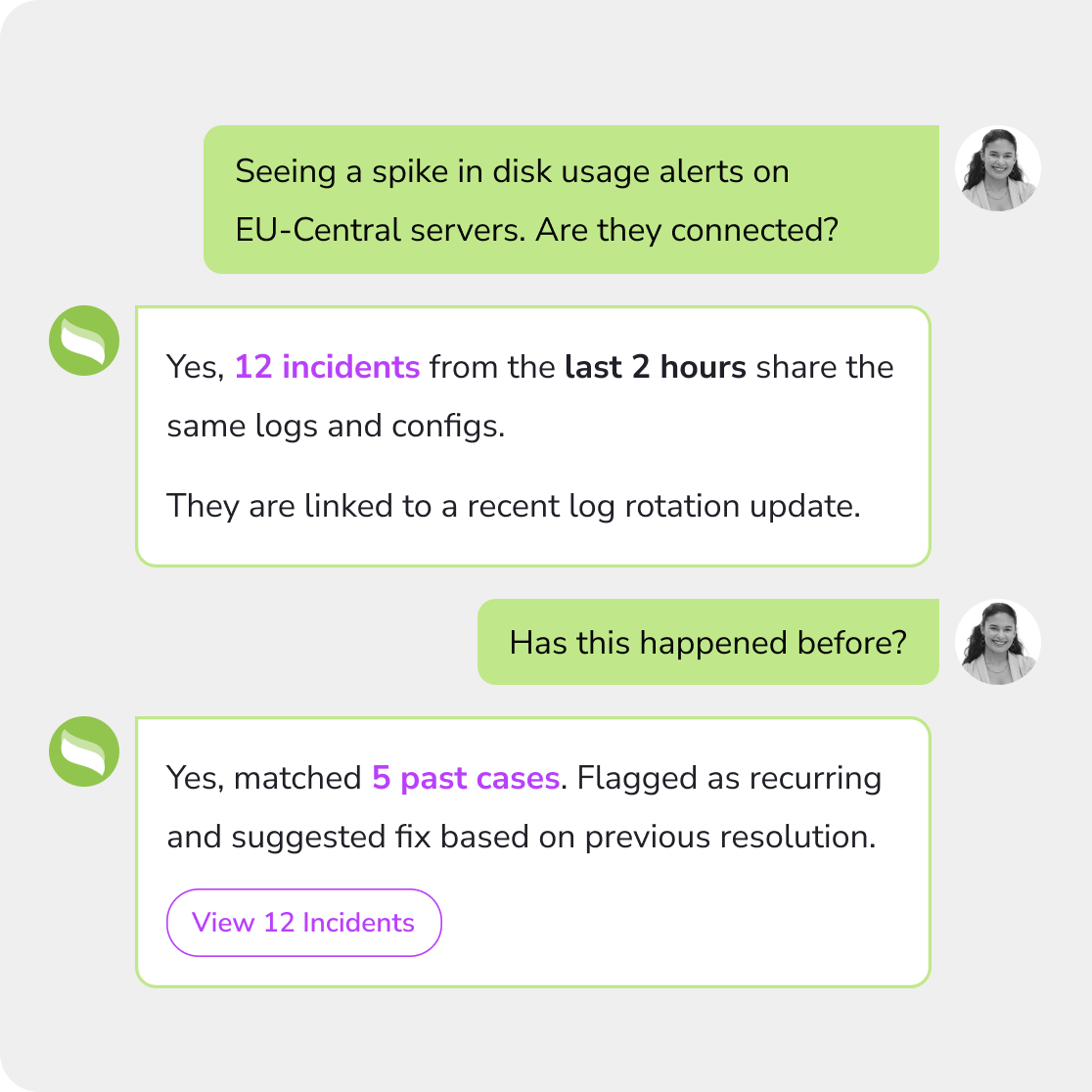 Reduce alert noise by up to 90% and minimize alert fatigue by analyzing logs, tickets, alerts, change requests, and more to cluster related incidents automatically. Using incident clustering, teams can also view all historical cases of a particular incident, helping them prioritize recurring issues and focus on what matters most.